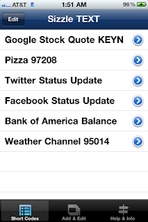 There is also an undocumented feature where you can just add a regular phone number as the short code number. So you could add the number of someone you regularly text, and SizzleTEXT becomes a 'short cut' for finding that number as a starting point for sending a SMS message.
